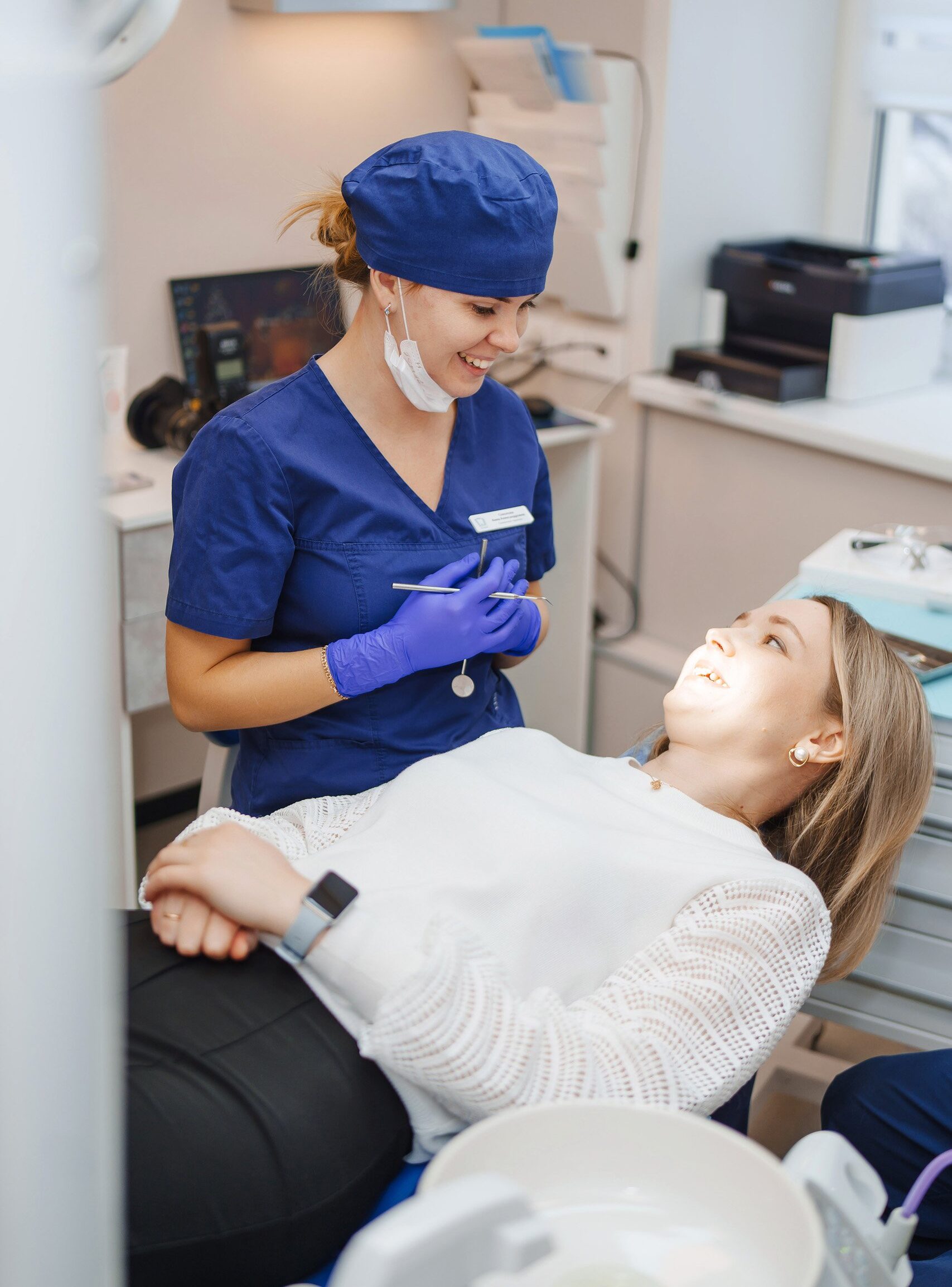 - Обучение и рекомендации. Врач объясняет, как правильно чистить зубы, показывает технику на примере и указывает, где чаще всего остаётся налёт. Это важный этап — мы не просто очищаем, а учим профилактике.